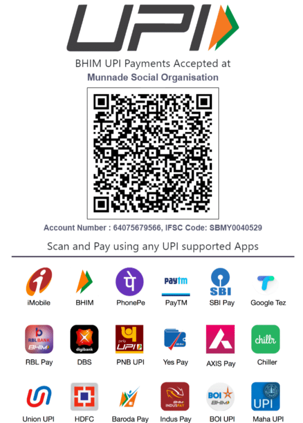 This channel of payment is valid only for donations within India. For Foreign Contributions please see the next section. Limit for paying through QR CODE (UPI) is Rs.2000. For larger amounts you must either do multiple UPI transactions or do a bank transfer (NEFT, IMPS). When making a payment please send us a soft copy of your adhaar and PAN card to info@munnade.org.