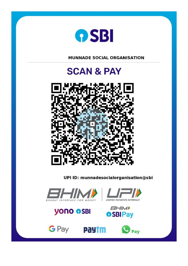 Limit for paying through QR CODE (UPI) is Rs.5,00,000 (Five Lakh Rupees).  When making a payment please send us a soft copy of your adhaar and PAN card to info@munnade.org. You can also do a bank transfer using the below bank details.